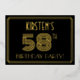 The front of this vintage-look and 1920s-1930s style inspired fifty-eighth birthday celebration foil invitation features a customisable name, a large art deco style inspired number “58TH”, the message “BIRTHDAY PARTY!”, and a border pattern consisting of lines. There is a black-coloured background on the front by default, but it can be customised to a different colour if desired. The back features personalised details about the event, such as the date, time, location, and any other information that may be relevant. Elegant, luxurious, customised invitations like these might be used to invite guests to a birthday celebration being held to celebrate somebody’s 58th birthday. [~Z0000590]
