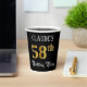 This opulent and elegant birthday paper cup design features a custom name and the message “58th Birthday Party”. The large number “58th” has an imitation/faux gold-inspired colouring pattern, the words “Birthday Party” are in luxurious script-style text, and the background is coloured black by default (although it can be customised). Ornate, fancy paper cups like this might be used at a birthday party being held to celebrate somebody’s 58th birthday. [~Z0000567]