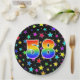This colourful, cheerful, and fun paper plate design features a large number "58" coloured with a rainbow spectrum gradient inspired pattern. The background features a colourful star shapes pattern. Fun paper plates like this might be used at a celebration being held to observe somebody’s 58th birthday, or a couple’s fifty eighth anniversary, or some other 58th event. [~Z0000493]