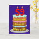 The front of this joyful and fun birthday-themed greeting card design features a depiction of a three-tier birthday cake having numeral-shaped candles on top showing the number “59“, along with the message “HAPPY 59TH BIRTHDAY,”, and a custom recipient name. The inside features a customisable birthday greeting message, or could perhaps be cleared and left blank if a message is to be written by hand instead. An upbeat, customisable birthday greeting card like this might be used to celebrate somebody’s fifty-ninth birthday. [~Z0000620]