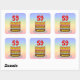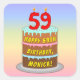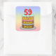 This fun and colourful birthday square sticker design features a cartoon-style depiction of a three-tier birthday cake having numeral-shaped candles on top showing the number “59“, along with the message “HAPPY 59TH BIRTHDAY,”, and an editable recipient name. The background features a multi-colour pastel rainbow spectrum inspired gradient pattern. Cheerful birthday themed stickers like these might be distributed or used at a party in celebration of somebody’s 59th birthday, or perhaps used when preparing invitations or gifts for such an event. [~Z0000624]