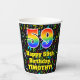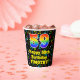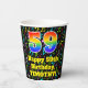 This colourful and exciting music themed birthday paper cup design features a large number “59” having a rainbow spectrum gradient inspired pattern. It also features the message “Happy 59th Birthday,”, and a customisable name. The background features a multicolored pattern of various music notes and symbols having a variety of colours and sizes. Colourful, vibrant paper cups like this might be fun to use at a birthday party being held in celebration of somebody’s 59th birthday. [~Z0000541]