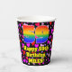 This fun and happy birthday themed paper cup design features a large number “59” with a rainbow spectrum gradient inspired pattern, along with the message “Happy 59th Birthday,”, and a custom name. The background features a pattern of red, pink, and purple heart shapes of various sizes. Happy, cheerful paper cups like this might be fun to have at a birthday celebration/party being held in celebration of somebody’s 59th birthday. [~Z0000548]