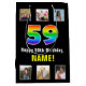This cheerful and bold birthday-themed gift bag design features a large number “59“ having a colourful rainbow spectrum inspired gradient pattern, plus the message “Happy 59th Birthday,“ and a personalised recipient name. The photos above and below the message can be personalised, perhaps with photos of the recipient, the recipient’s family and friends, and/or the sender(s) of the gift. A birthday themed giftbag like this might be used when giving a gift or present in celebration of somebody’s fifty-ninth birthday. (Photography © Storytree Studios, Stanford, CA.) [~Z0000669]