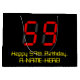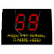 This silly and fun birthday themed gift bag design features a large number "59" having a red seven segment digital display style appearance, along with the message "Happy 59th Birthday," and a personalised name in geeky retro style yellow text, on a black coloured background. Personalised gift bags like this might be used when wrapping presents or gifts being given in honour of somebody’s fifty ninth birthday. [~Z0000389]