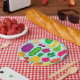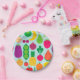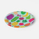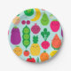 A pattern of happy colourful fruit and vegetables on a blue background, including a peach, banana, pineapple, watermelon, pear, cherries, radish, aubergine (eggplant), brussels sprout, peas, radish and red pepper (bell pepper).