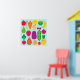 A pattern of happy colourful fruit and vegetables on a blue background, including a peach, banana, pineapple, watermelon, pear, cherries, radish, aubergine (eggplant), brussels sprout, peas, radish and red pepper (bell pepper).