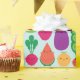 A pattern of happy colourful fruit and vegetables on a blue background, including a peach, banana, pineapple, watermelon, pear, cherries, radish, aubergine (eggplant), brussels sprout, peas, radish and red pepper (bell pepper).