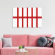 This bold geometric pattern, inspired by a railroad map symbol, features five vertical red lines split in half by a horizontal red line down the centre. The red on white pattern has a strong spartan look.
