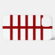 This bold geometric pattern, inspired by a railroad map symbol, features a central vertical red stripe crossed perpendicularly by five horizontal red lines. The red on white pattern has a strong spartan look.