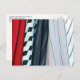 Five undulating sections of fabric comprise the colour photograph, a sneak peak close-up of shirts hanging in my closet. From left to right: red linen; polyester decorated with diamonds of black, light blue, and off-white; navy linen with pairs of thin grey stripes; pale blue polyester with pairs of fine off-white stripes and alternating navy and red accent stripes; and white cotton with alternating blue and black stripes like those used in ticking.