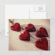 5 distressed and weathered looking wooden hearts. These deep red hearts are attached to a fine rope and strung together to create a necklace pendant. These dangling hearts sit together on a cream textured background. The heart is a symbol of love, affection, romance and passion.