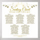 This chart shows seating assignments for five tables at your wedding reception. The design is simple yet elegant with gold text and a beautiful lacy floral filigree border.