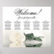 This exquisite wedding seating chart accommodates 50 guests across five tables, with 10 seats per table. The design is a beautiful blend of class, elegance, and romance, showcasing a single long-stemmed ivory, white, or cream coloured rose gracefully reflecting in a tranquil pool of water. The title, rendered in tasteful script calligraphy, warmly invites guests with "Welcome! Please find your table," leaving ample space below for the couple's names and wedding date. This seating chart serves as a charming and practical way to welcome guests and help them locate their assigned seats at the wedding reception, exuding an air of grace and sophistication.