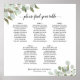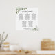 This elegant 5 table seating chart includes table assignments for 50 guests with 10 seats per table. The rustic bohemian chic design features hand painted watercolor eucalyptus leaves and foliage in shades of mint, moss and sage green. The lacy script calligraphy title reads: Please find your table, and the names of the couple and wedding date appear at the bottom.