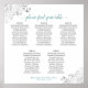This 5 table wedding seating chart will help your guests find the right table at your reception. The design is both simple and elegant with dark grey and teal or turquoise text on a white background and lacy silver faux foil floral filigree in the corners. The title reads "please find your table" in an elegant script calligraphy. Sophisticated and chic. Includes table assignments for 50 guests with 10 seats per table.