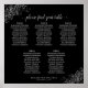 This 5 table wedding seating chart will help your guests find the right table at your reception. The design is both simple and elegant with pale grey text on a black background and lacy silver faux foil floral filigree in the corners. The title reads "please find your table" in an elegant script calligraphy. Sophisticated and chic. Includes table assignments for 50 guests with 10 seats per table.