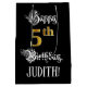 This opulent and elegant birthday giftbag design features the message “Happy 5th Birthday,”, along with a custom recipient name. Part of the message is in a luxurious script-style text, the large number “5th” features a faux/imitation gold-inspired look pattern, and the background is coloured black. A birthday themed gift bag like this might be a respectable way to wrap a gift or present being given to celebrate somebody’s 5th birthday. [~Z0000560]