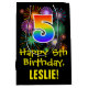 This fun, exciting, and colourful birthday themed gift bag design features a large number "5" with a rainbow spectrum gradient inspired pattern, along with the message "Happy 5th Birthday,", and a customisable recipient name. It also features a colourful background pattern inspired by the look of bursting celebratory fireworks. A birthday themed gift bag like this might be a fun way to wrap a gift or present being given to celebrate somebody’s 5th birthday. [~Z0000509]