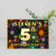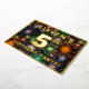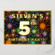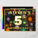 The front of this fun and exciting fifth birthday celebration foil invitation card design features a personalised name, a large number “5th”, the message “BIRTHDAY PARTY!”, and a border. The background of the front has a bold, multicolored pattern that resembles bursting celebratory fireworks. The back features personalised details about the event, such as the date, time, place, and any other information that may be relevant. Personalised invitations like these might be a fun way to invite attendees to a birthday party being held to celebrate somebody’s 5th birthday. [~Z0000602]