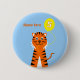 Personalise this badge button for the birthday child by adding their name. This cute tiger has a yellow 4th birthday balloon and there is space ready for you to add the name in tiger-orange; all on a light blue background.