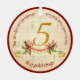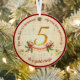 Celebrate the 5th Day of Christmas with this radiant “Five Golden Rings” ornament, a shining highlight of the Twelve (12) Days of Christmas collection. The front features a grand gold “5” as the focal point, with five gleaming golden rings strung along a graceful red ribbon just beneath it. Sprigs of holly adorn each end of the ribbon, adding a touch of classic Christmas cheer. Behind the design, softly faded parchment sheet music provides an elegant vintage backdrop, framed by a festive red circle. The words “The 5th day of Christmas my true love gave to me” curve across the top, while “five golden rings” completes the composition below, each phrase accented by small golden pears.