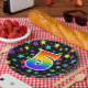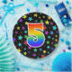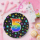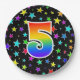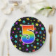 This fun, colourful, and cheerful paper plate design features a large number "5" containing a rainbow spectrum gradient inspired pattern colouring. The background features a colourful star shapes pattern. Paper plates like this might be fun to use at a party being held to celebrate somebody’s 5th birthday, or a couple’s 5th anniversary, or some other 5th event. [~Z0000493]
