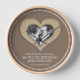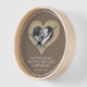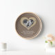 Wood heart wedding anniversary clock personalise with your own couples photo, year of marriage, and names or relationship to you. The example reads Emily & Matthew Vermeulen 5th Wood Wedding Anniversary and your marriage and current date. Other matching five years married wedding anniversary heart gifts and cards are available and clock styles this clock has no numbers only a ring of time marks. Carved wooden heart effect graphic art and design by Sarah Trett for www.mylittleeden.com (Placeholder photo image thanks to Crystal Shaw at Unsplashed)