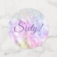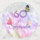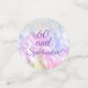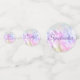 These fun confetti discs feature shimmering shades of purple, pink and yellow with pastel glitter sparkles cascading down from the top. Delicate butterflies are resting on the text. Each side has a different design.