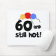 Primary colours balloons and black text that reads "60 and still hot!" on 60th birthday T-shirts, mugs, buttons, cards, and other birthday gear!