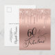 Elegant and chic 60th birthday party postcard invitation with "60 & Fabulous" written in stylish script against a rose gold background and rose gold faux glitter dripping from the top. Easily personalise with her name and the sixtieth birthday party details.
