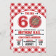 60th Birthday Barbecue Invitation with a red hot grill and gingham tablecloth pattern. Customise with your own text. Original Illustration by pj_design.