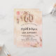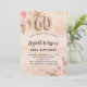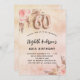 A rose gold, blush pink rustic faux metallic looking background. Decorated with rose gold and pink florals, roses, pampas grass. Personalise and add a name and party details. Number 60 is written with a balloon style font.