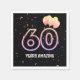 Party balloons and confetti on black background with the neon number 60 for a 60th birthday party.