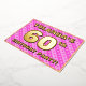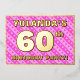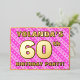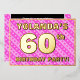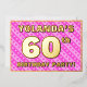 The front of this fun sixtieth birthday party/celebration foil invitation card design features a customisable name, a large number “60th”, the message “BIRTHDAY PARTY!”, and a border. The background of the front has a loving dark pink and light pink striped pattern containing heart shapes. The back features personalised details about the event, such as the date, time, place/venue, and any other useful information. Customisable invitations like these might be a fun way to invite guests/attendees to a birthday party/gathering being held in celebration of somebody’s 60th birthday. [~Z0000603]