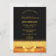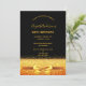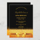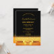 A modern, stylish and glamourous invitation for a woman's 60th birthday party. A chic black background with an elegant faux gold bow, ribbon and sparkle. The name is written with a modern golden hand lettered style script. Templates for your party details.