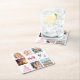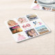 A party coaster for a girly 60th birthday party, celebrating her life with a collage of 8 of your photos. Templates for a name, age 60 and a date. Date of birth or the date of the party. Coral and burgundy coloured letters. White background.