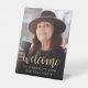 This custom 60th birthday party welcome sign features the guest of honour's personalised photo, name, and birthday, along with the word "welcome" in elegant gold-coloured calligraphy script. A dark screen helps make the text pop. A great way to celebrate someone who's turning sixty!