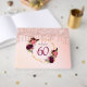 A Guest Book for a 60th birthday party. A chic golden and blush pink gradient background with a faux gold geometric frame. Decorated with dark purple and burgundy flowers, roses and boho style feathers. Rose gold drips, paint drip look on the front and the back. Templates for a name, age 60 and a date. Date of birth or the date of the party. The name is written with a hand lettered style script, pink coloured letters, age in purple and the date with black numbers. Add your text on the spine.