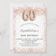 For an elegant 60th birthday. A white background. Decorated with rose gold, pink faux glitter, sparkles. Personalise and add a name, and party details. The name is written with a hand lettered style script, number 60 with balloon style fonts.