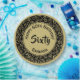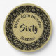 This over-the-hill design has a coral and white random number pattern with the gold milestone number 60 'repeated in varied sizes and angles for an all-over print. There is a gold circle in the centre for your text and black and gold rings around the rim.