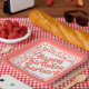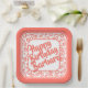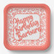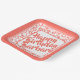 This over-the-hill design has a coral and white random number pattern with milestone 60 repeated in varied sizes and angles for an all-over print. There is a white square in the centre for your “Happy Birthday Name” and a teal and white frame around the rim.