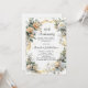 A white background. Decorated with white and yellow florals and a golden ribbon and faux diamonds. Personalise and add a name and details.