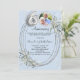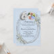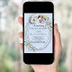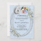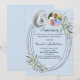 A light blue background. Decorated with greenery, an oval frame and faux diamonds. Personalise and add a photo, names and details.