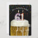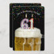 Number 61 birthday candles in mug of beer with colourful confetti on black for 61st birthday party invite.