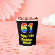 This fun and exciting birthday themed paper cup design features a large number “61” with a rainbow spectrum gradient inspired pattern, along with the message “Happy 61st Birthday,”, and an editable name. It also has a black-coloured background. Colourful, vibrant paper cups like this might be fun to have at a birthday celebration/party being held in celebration of somebody’s sixty first birthday. [~Z0000537]