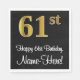This stylish, luxurious, and sophisticated birthday-themed paper napkin design features a large ordinal number “61st” having an imitation/faux gold-inspired gradient pattern, in addition to the birthday greeting message “Happy 61st Birthday,” and an editable name in a script-style font. The background is coloured black. Paper napkins like this might be used when celebrating somebody’s sixty first birthday. [~Z0000516]