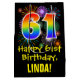 This colourful, fun, and exciting birthday themed gift bag design features a large number "61" with a rainbow spectrum gradient inspired pattern, along with the message "Happy 61st Birthday,", and a customisable recipient name. It also features a colourful background pattern inspired by the look of bursting celebratory fireworks. A birthday themed gift bag like this might be a fun way to wrap a gift or present being given to somebody who is celebrating their 61st birthday. [~Z0000509]