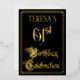 The front of this fancy and opulent foil sixty-first birthday celebration/party invitation design features the message “61st Birthday Celebration” in elegant script-style text. It also has an editable name. The background of the front is coloured black by default (although it can be customised to a different colour). The back features personalised details about the event, such as the date, time, location, and any other information that may be relevant. Ornate, elegant, editable invitations like these might be used to invite guests to a birthday celebration being held to honour somebody’s 61st birthday. [~Z0000589]