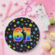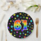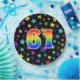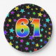 This cheerful, fun, and colourful paper plate design features a large number "61" containing a rainbow spectrum gradient inspired pattern. The background features a colourful star shapes pattern. Fun paper plates like this might be used at somebody’s sixty first birthday celebration, or a couple’s 61st anniversary party, or some other 61st event. [~Z0000493]